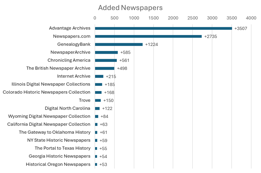 As seen below, the majority of new additions came from a small number of providers: Advantage Archives and Newspapers.com are the clear winner in new publications over the last year. Newspapers.com remains one of the largest and most actively updated newspaper platforms, and this update reflects their continued expansion.